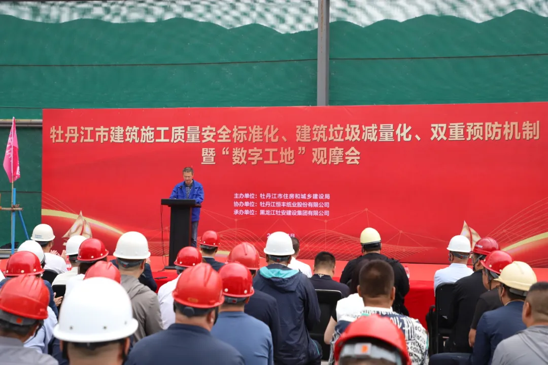 6月21日,由市住房和城鄉(xiāng)建設(shè)局主辦,黑龍江牡安建設(shè)集團(tuán)承辦的“牡丹江市建筑施工質(zhì)量安全標(biāo)準(zhǔn)化、建筑垃圾減量化、雙重預(yù)防機(jī)制暨數(shù)字工地觀摩會(huì)”在牡安集團(tuán)承建的恒豐紙業(yè)項(xiàng)目隆重舉行。市住建局副局長(zhǎng)畢傳鵬、市工程質(zhì)量技術(shù)服務(wù)中心主任孫勇、黑龍江牡安建設(shè)集團(tuán)董事長(zhǎng)、總經(jīng)理張秋以及市住建局、各縣(市)、開發(fā)區(qū)住建局、質(zhì)量安全中心(站)的有關(guān)領(lǐng)導(dǎo)、市區(qū)在建項(xiàng)目的各位同仁參加了本次活動(dòng)。